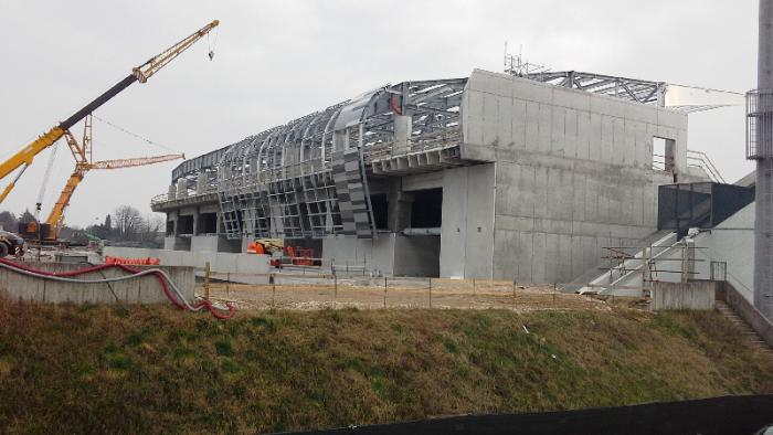 Дело в том, что стадион Фриули перемодернизируется.Сокращается кол-во мест, но сам стадион становится современнее и комфортабельнее. Удинезе не богатая команда, но вслед за Ювентусом, решила построить свой стадион. на месте старого.Стройка ведется уже с год и изменения видны по телевизионным репортажам.Но окончание еще не скоро, думаю, что еще как минимум до осени начала следующего сезона. Вот эти полосы на фото-это места стоянки автомобилей. Стоянка бесплатная и в дни матчей она вся заполнена автомобилями.Поставил я свой автомобиль и направился ко входу.Народ потихоньку собирался и небольшими ручейками подходил к контролю и воротам на вход.Перед входом, как это характерно для стадионов во многих странах, стояли передвижные мини-киоски по продаже атрибутики: футболки, чашки, брелки, шарфы, бейсболки и прочая атрибутика.Купил я себе футболку за 25 евро, шарф Удинезе за 10 евро и направился к билетному контролю.Контроль прошел без проблем, поближе сфотографировал перестраивающуюся трибуну