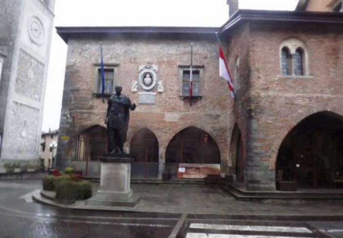 Дворец XIV-XV века (Palazzo e la loggia del Comune) c памятником Юлию Цезарю