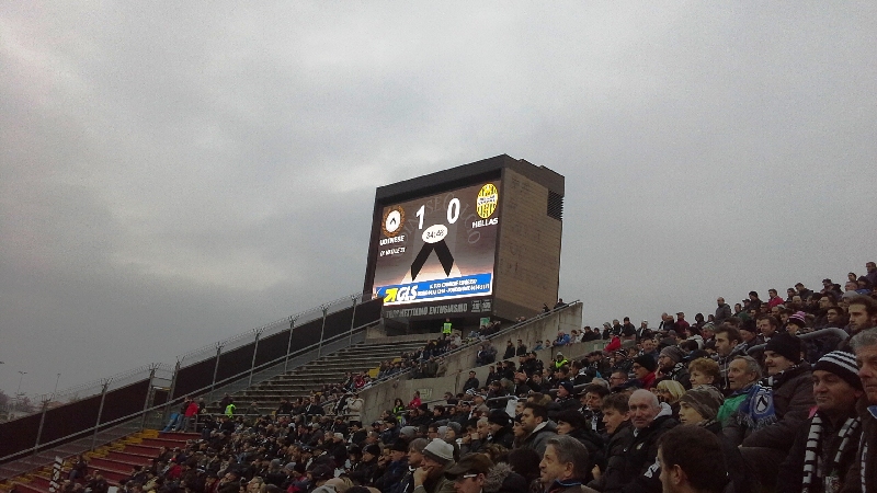 Подошел к трибуне поближе, народ собирался. Центральная трибуна стремительно наполнялась.И вот тут то я попал в не очень приятную ситуацию. Оказалось, что моя трибуна curva sud (южная) имеет свой отдельный вход и чтобы попасть на нее надо выйти снова к билетному контролю и тогда пройти в другую сторону, обойдя центральную трибуну.Ничего не поделаешь, но контроль я уже прошел.Возникла неприятная ситуация, когда уже считай попал на стадио, а теперь надо выходить. Показал стюарду свой билет, объяснил, что не знаю как пройти к своей трибуне. Добавил при этом, что я являюсь болельщиком Удинезе и почитателем таланта Антонио Ди Натале-кумира местных болельщиков. Он объяснил все эту стюарду, непосредственно стоящему на сканер-контроле и тогда посовещавшись.они решили меня провести через центральную трибуну, а дальше даже через подтрибунные помещения.Я шел вместе со стюардом и он меня провел через помещения, которым посторонним не суждено посещать.мельком видел бар, дорожки ковровые, людей в деловых костюмах.Кто это был не знаю, но не исключаю, что это кто-либо из руководящего штата клуба.парень этот стюард до конца меня не довел, а передал другому сопровождающему.Вот так мы с ним наконец вышли с подтрибунных помещений немного прошли по дорожке возле трибун с обратной стороны и наконец подошли к сканер-контролю перед трибуной Curva-Sud.В Италии фанатские трибуны, а стоимость билетов туда подешевле, называются Curva переводится как закругление.Так называются трибуны за воротами. Первое мое посещение такой трибуны состоялось в сентябре 2011 года в Болонье. Играли местная Болонья и Интер(Милан).