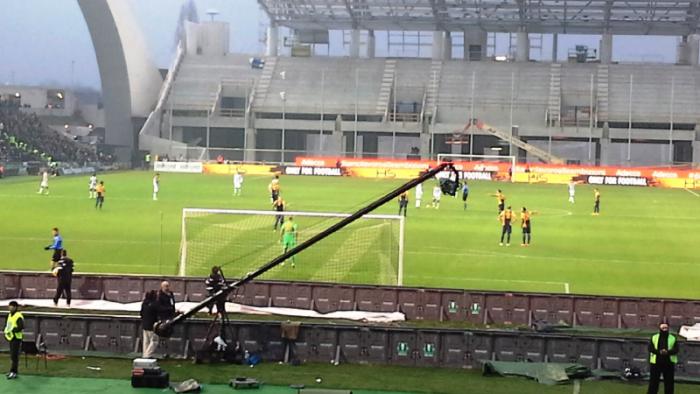 Атаки надвигались на ворота за которыми я сидел.Вот опасный штрафной, болельщики надеются на то, что он будет результативным