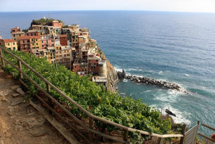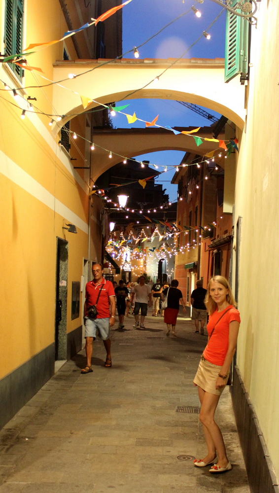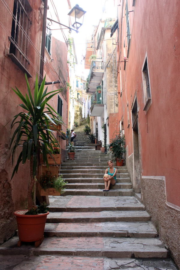 Но мы не стали грустить – нас ждал интересный день в одном из самых романтичных мест нашего путешествия. Рядом с г.Ля-Специя находится природный парк Чинкве Терре – это территория, объединяющая 5 маленьких деревень, расположенных каскадом на скалистых утесах в окружении виноградников и оливковых рощ. Так как парк является заповедником, движение на автомобиле там ограничено, передвигаться можно либо пешком по множеству живописных маршрутов, либо на поезде. Мы, доехав до одной из деревушек, бросили машину и пошли гулять на своих двоих. Планировали посетить ближайшие деревушки, очень хотелось пройтись по «дороге любви» от деревни Риомаджоре до Манарола. Согласно легенде на этой дороге у источника встречались двое влюбленных из враждующих деревень. У этой истории, как и у всех других историй о запретной любви, грустный конец.