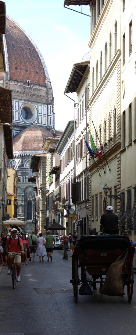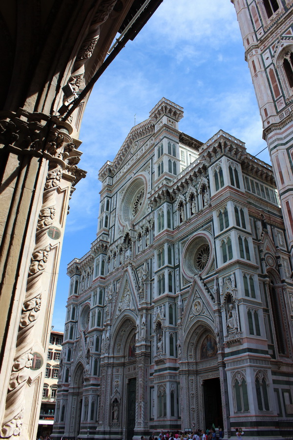 В центре – самое массивное здание и символ Флоренции – собор Санта Мария дель Фьоре. Когда мы добрались до собора и первый раз его увидели – не поверили глазам – он ОГРОМЕН. Стены с десятками статуй и бесконечным числом декоративных элементов, узоров, витражей, орнаментов, и гигантских размеров купол. От красоты и грандиозности бегут мурашки. Испытываешь какое-то благоговение от мысли, что тысячи людей в течение 6 веков строили это здание, сколько средств не жалели правители и не прекращали строительство. В наше время это уже невозможно…