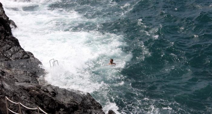 Мы очень удивились, что среди этих скал купаются люди – прямо к камням приделаны поручни и чтобы спуститься или вылезти из моря необходимо дождаться очередной волны.