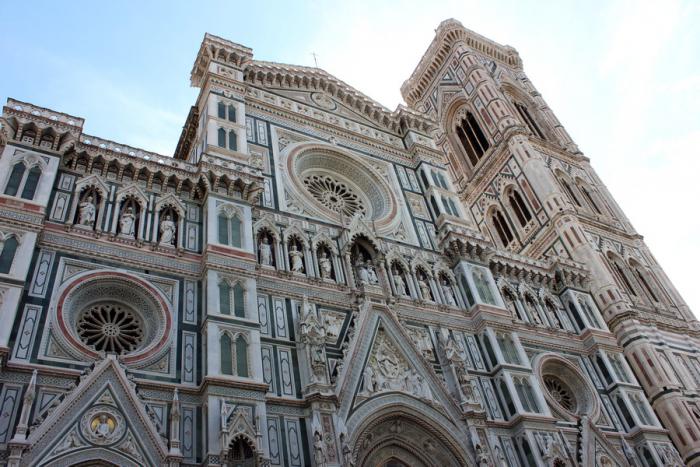 Помимо здания в соборный комплекс входит баптистерий Сан-Джованни и колокольня Джотто. Восьмигранное сооружение баптистерия появилось раньше собора. Главное его украшение – удивительные двери, декорированные библейскими сюжетами. Их еще называют «врата рая». 85-метровая колокольня Джотто с 7 колоколами (самый большой 3м. диаметром) начала строиться в 1334г. Очень красивое здание, трудно оторвать глаза.