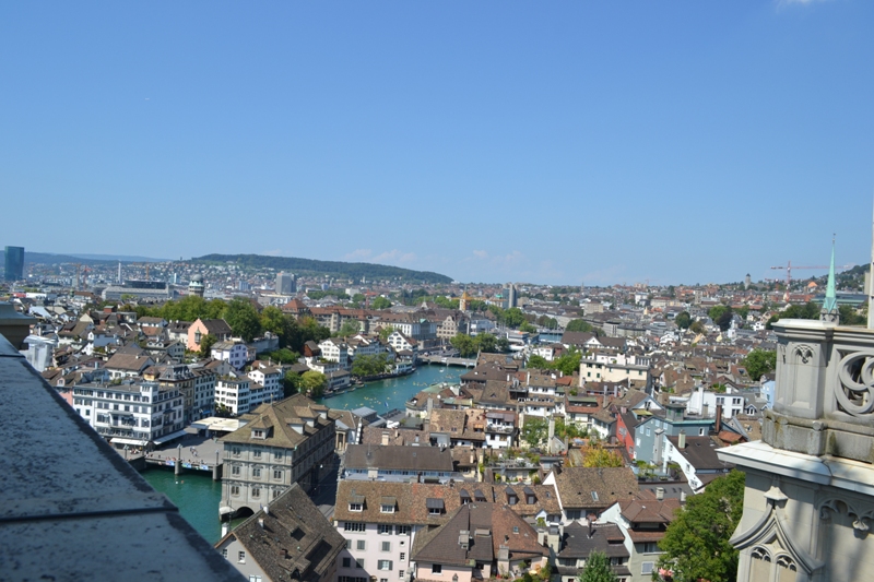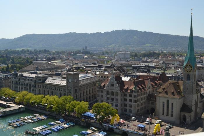 Мы решили, что именно с башни Гроссмюнстера должен быть интересный вид на город сверху. За 4 фр с человека по крутой винтовой лестнице поднялись на самую верхотуру. Панорама действительно красивейшая.