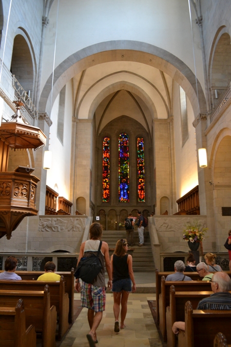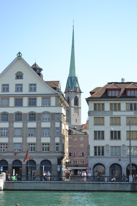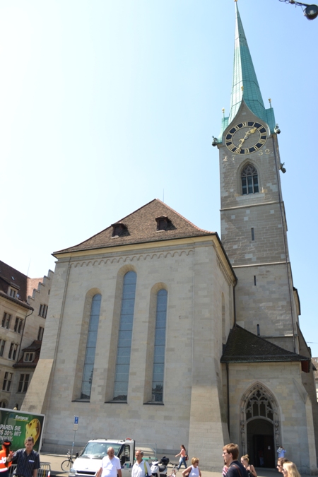 Церковь Фраумюнстер (Fraumunster) — 13 век, с элегантным зеленым шпилем и пятью витражами Марка Шагала (1970г). Церковь Фраумюнстер принадлежала к числу популярнейших женских монастырей. К сожалению витражи не получились на фото, но зайти посмотреть, конечно стоит.