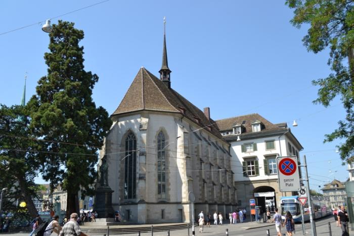 Так опять подошли к мосту Мюнстер, только с другой стороны. Здесь уже поближе рассмотрели церковь Вассеркирхе. Wasserkirche (что значит «Водная Церковь») впервые упоминается примерно в 1250 году. Эта церковь построена на небольшом островке на реке Лиммат, между Гроссмюнстер и Фраумюнстер.