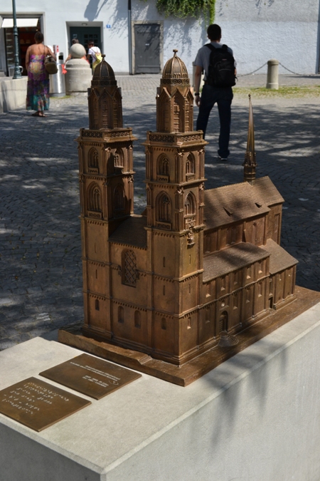 Ну и, наконец, мы подошли к Гроссмюнстеру. Собор Grossmunster — мужской монастырь Гроссмюнстер, на протяжении Средних веков, постоянно конкурировал с Фраумюнстер, что находился по другую сторону реки Лиммат. Для того, чтоб оспаривать первенство и удержать приоритет в споре с Фраумюнстер, который был основан внуком Карла Великого – Людовиком Немецким, была обнародована легенда, согласно которой, Карл Великий нашел могилы городских мучеников Феликса и Регулы и, самолично, построил церковь на том месте, где с 1090 года начался строиться собор Гроссмюнстер.