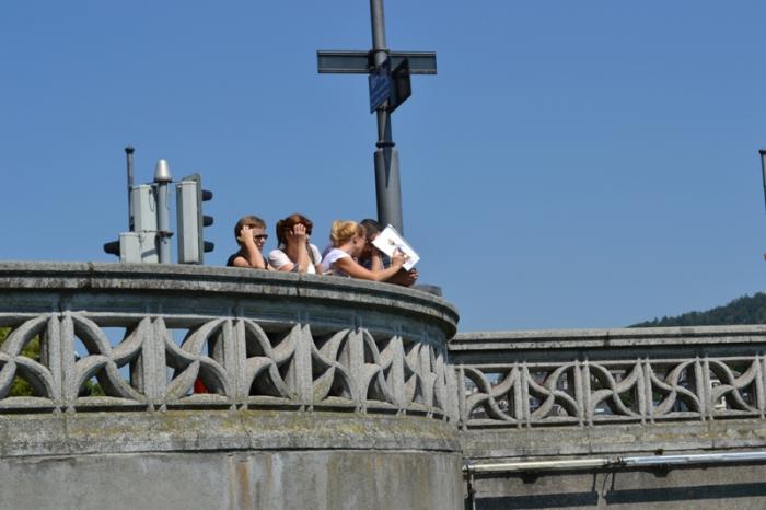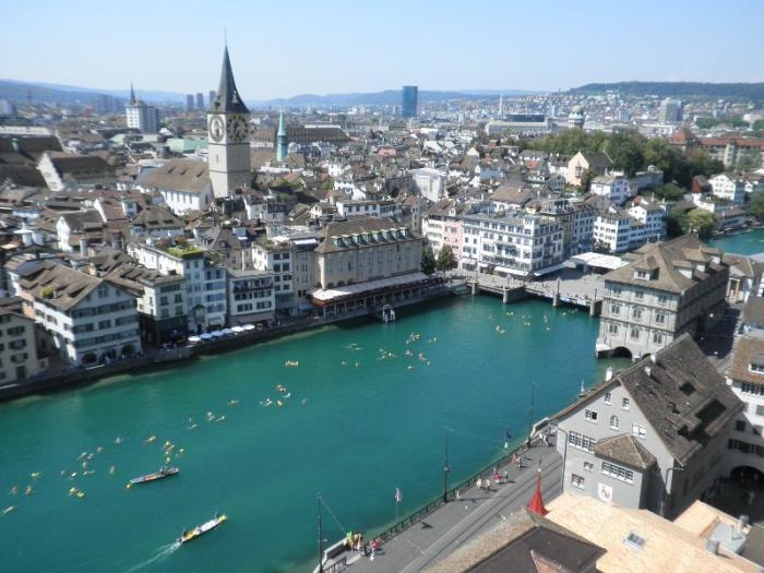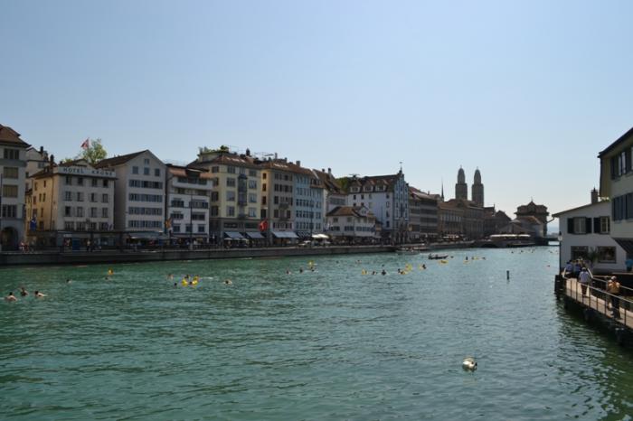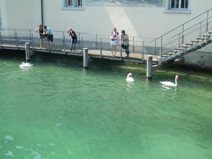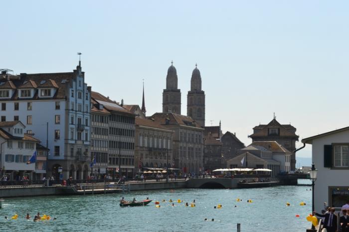 На реке происходило какое-то интересное мероприятие – городской заплыв на надувных уточках. Толпы плывущих цюрихчан рассекали прозрачную гладь реки. Нам было очень завидно, так как день жаркий, а мы с самолета из пасмурного Питера!