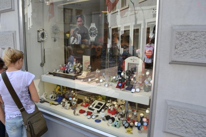 Отсюда мы опять спустились к реке, перешли через мост и по Банхофштрассе вернулись к вокзалу. По пути заглядывали в часовые магазины, чтобы хотя бы понимать, что и за сколько.