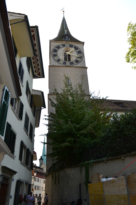 С набережной можно подняться к площади Lindenhof. Линденхоф (Lindenhof) — спокойная тенистая площадь в самой старой части Цюриха с прекрасным видом на реку (в переводе Липовый холм). Раньше здесь располагался римский замок, а также было местом сбора налогов. Но мы как-то промахнулись мимо и, блудя по старым улочкам, увидели перед собой Церковь Святого Петра (St.Peter-Kirche).