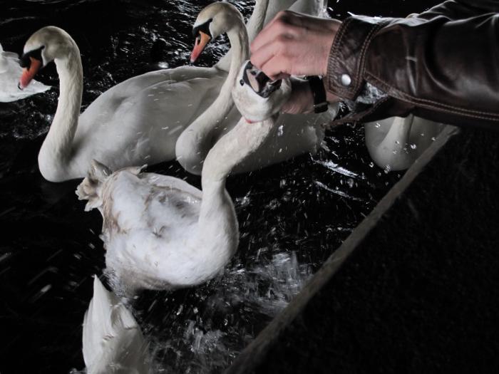 Лебеди намного глупее чаек. За еду они теряют разум и волю.