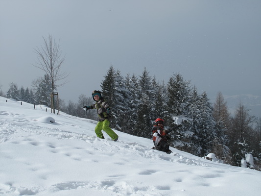 «Стооооп!» — сказали мы себе, увидев перед собой второстепенную дорожку, уходящую змейкой куда-то за холм. И повернули на нее. И через 15 минут – вот! Снега по пояс!!! Невероятно, внизу плюс семь!