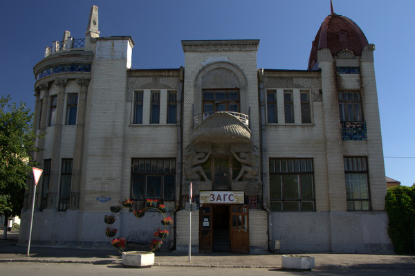 Прошли мимо особняка купца Стерлядкина. Одним из самых красивых памятников архитектуры, сохранившихся до наших дней в Сызрани, считается особняк купца Стерлядкина. Двухэтажный дом в центре города строился с 1908 по 1914 гг. из инновационных материалов и применением высокотехнологического для того времени оснащения по заказу мукомольного магната Сергея Стерлядкина. Авторство проекта особняка документально не подтверждено, но по одной из версий, эскизами занимался один из известнейших архитекторов того века — Фёдор Осипович Шехтель. В разработке мелких архитектурных деталей и композиционных особенностей, возможно, участвовали Зеленко, Вакано и Щербакова.
