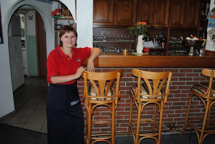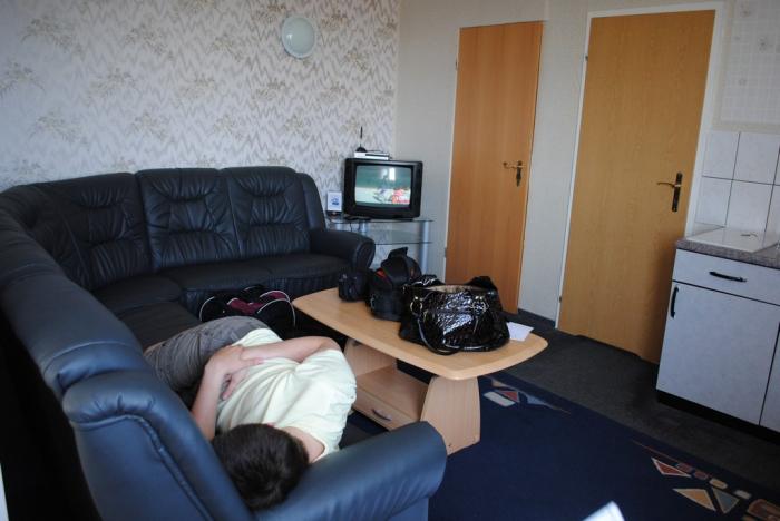 Гостиница выглядела прекрасно, как выяснилось – изнутри она выглядит еще лучше. Ищем вход: смотрим дверь и написано «ресторан». Подходим к барной стойке и видим милую девушку немку. «Гудентак!» — говорю. «Где вход в отель?» — прибавляю на английском. Девушка отвечает, что, мол, здесь вход. Протягиваю распечатку брони с букинга. Немка, увидев мою фамилию, и наши физиономии, тут же сказала: «Шпрехин русиш?». Я радостно отвечаю, что да, и беседа продолжилась на чистом русском языке. Оказалось, что наша немка, сама родом с Украины. Какое счастье услышать на чужбине родную речь! Мы оплатили 51 евро за номер наличными и нам дали ключ. Идем в сторону номера, я верчу ключ в руках: толи это «6» толи это «9», а спросить забыл на радостях. Вижу еще одну сотрудницу отеля, на этот раз, коренную немку, и спрашиваю, какой номер? Она отвечает: «Зэкс!», после чего мы открыли шестой номер и расположились там. Номер этот по площади был с нашу московскую квартиру. Прихожая с телевизором и диваном, спальня, мини-кухня с мойкой и холодильником, просторный санузел.