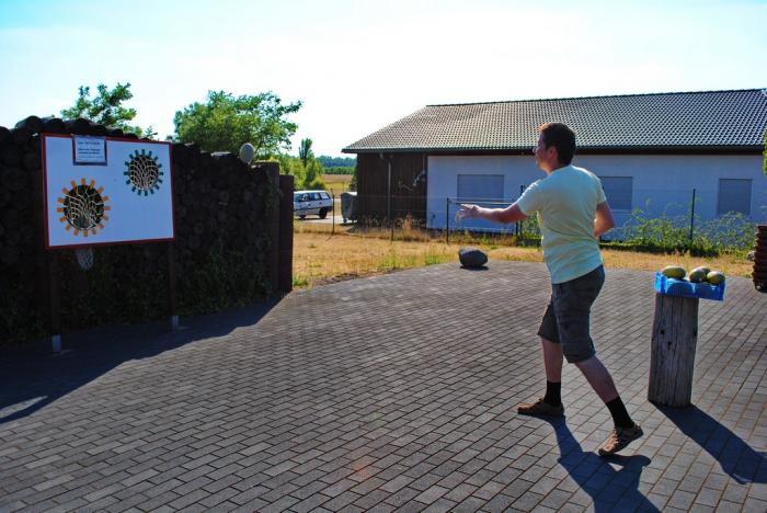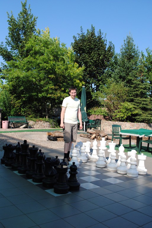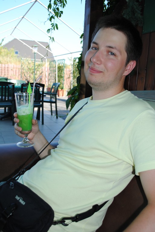 Перетащив вещи и немного отдышавшись от дороги, мы спустились в ресторан, где наша немка помогла нам выбрать блюда. Друзья, если бы мы проделали весь этот путь только ради этого ресторана – я не пожалел бы ни капли. Это был, пожалуй, самый вкусный и самый интересный ресторан за все путешествие. Внутри стояли ретро-автомобили, а стены были украшены коллекциями марок, денег и прочими атрибутами. Порции в ресторане были ну очень огромные. Даже больше, чем любит накладывать наша бабушка, а накладывает она ох как не мало. Еда была очень вкусной. Ресторан в Бресте – просто жалкая пародия по сравнению с тем, что мы видели и ели в Германии. Второе мы доедали уже с огромным трудом, а ведь, как на зло, мы еще заказали яблочный штрудель на десерт. Штрудель подали с двумя шариками мороженного и сгущенкой. Один мы съели, а порцию жены забрали в номер и поставили в холодильник. Обед обошелся нам чуть более 50 евро за двоих. Немного отдохнув, мы принялись осматривать территорию отеля и фотографироваться. На территории — большая зона отдыха с лавочками, большими напольными шахматами и всякими другими играми. Также там есть загон с кроликами, которых заботливый владелец отеля кормил при нас какими-то листьями. По отелю и прилегающей территории понятно, что хозяин очень любит свое заведение. Все вылизано и ухожено. Поиграв во всякие игры, вроде кидания колец или мячей, мы уселись под навес на кожаный диван. Подошла наша немка и предложила что-нибудь выпить освежающего. Мы заказали пару безалкогольных коктейлей «Big Apple», где-то по 3 евро за штуку, так же я спросил, можно ли купить бутылку минералки. Та вода, что мы привезли из России, уже закончилась, а магазинов рядом нет. Бутылка 0,7 обошлась целых 5,5 евро. В следующий раз привезу с собой запас! Я заплатил за воду, скрипя зубами, но уж слишком сильно не хотелось садиться опять за руль и искать супермаркет. До утра этой воды хватило, а потом мы купим на заправке.