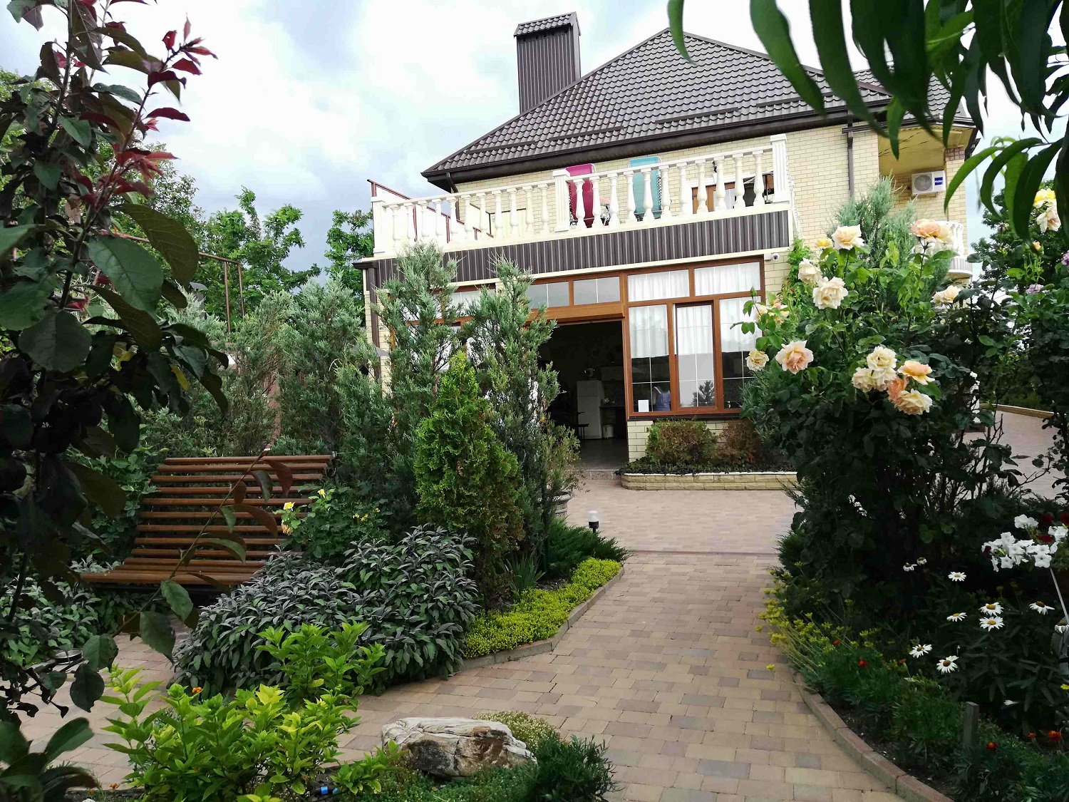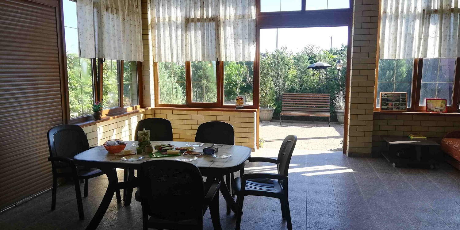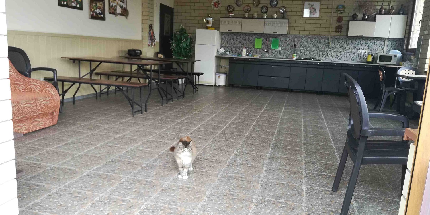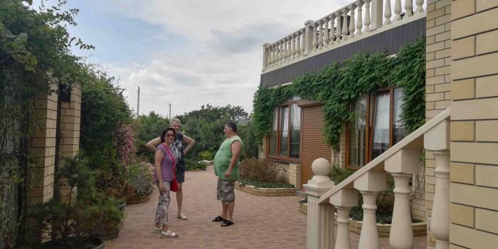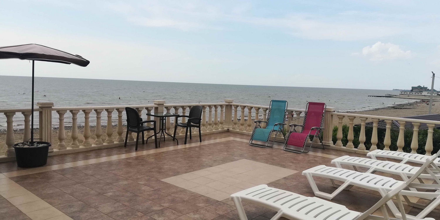 Приятно удивились комфортности забронированного жилья — гостевой дом «Азовский берег» оказался даже лучше, чем в описании и на фото. Хозяин рассказал, что обычно у него все забито сильно заранее. Но тут весь июнь людям пришлось отменять, так что мы попали, считай, к началу сезона и были практически единственными гостями в этом доме на берегу на 7 комфортабельных номеров, с парковкой, кухней-столовой, мангалом и цветуще-плодоносящим садом. Правда уже в субботу все номера были заполнены
