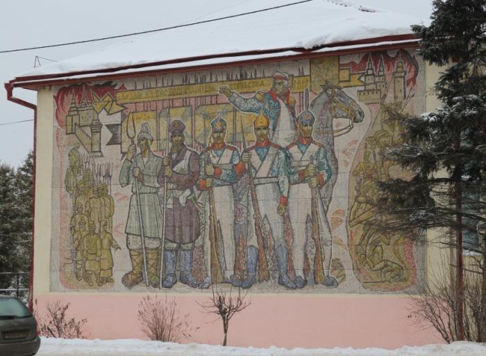Около 11.00 заурчало в животах. Прищло время заврака. Как ни странно. но в Можайске общепит просыпается к обеду, а именно в 12.00. И только одно кафе «Шоколад» работает с 10 утра. Но, то ли у них был переучет, то ли мы не приглянулись, но дверь нам не открыли. Снаружи кафе нам даже очень понравилось, но тщетные попытки попасть внутрь так не к чему и не привели. С торца здания интересная мозайка.