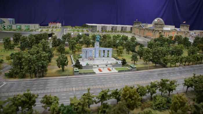 и, далее, опять по дорожкам парка, двинулись в сторону Бранденбургских ворот. Когда они уже показались вдалеке, муж занервничал, что мы, передвигаясь по тропинкам, а не по самой улице 17 июня, пропустили Мемориал Советскому солдату, даже предложил вернуться к площади и пройти путь заново уже по улице. Оказалось, переживали напрасно, пройдя еще немного, вышли напрямую к Мемориалу. Перед ним шумела и веселилась ярмарка, группы подростков, оседлав стоящие по бокам пушки, размахивали флагами с гербом Берлина. Но сам Мемориал, несмотря на праздник, царивший вокруг, поразил своей величественной строгостью, даже суровостью.