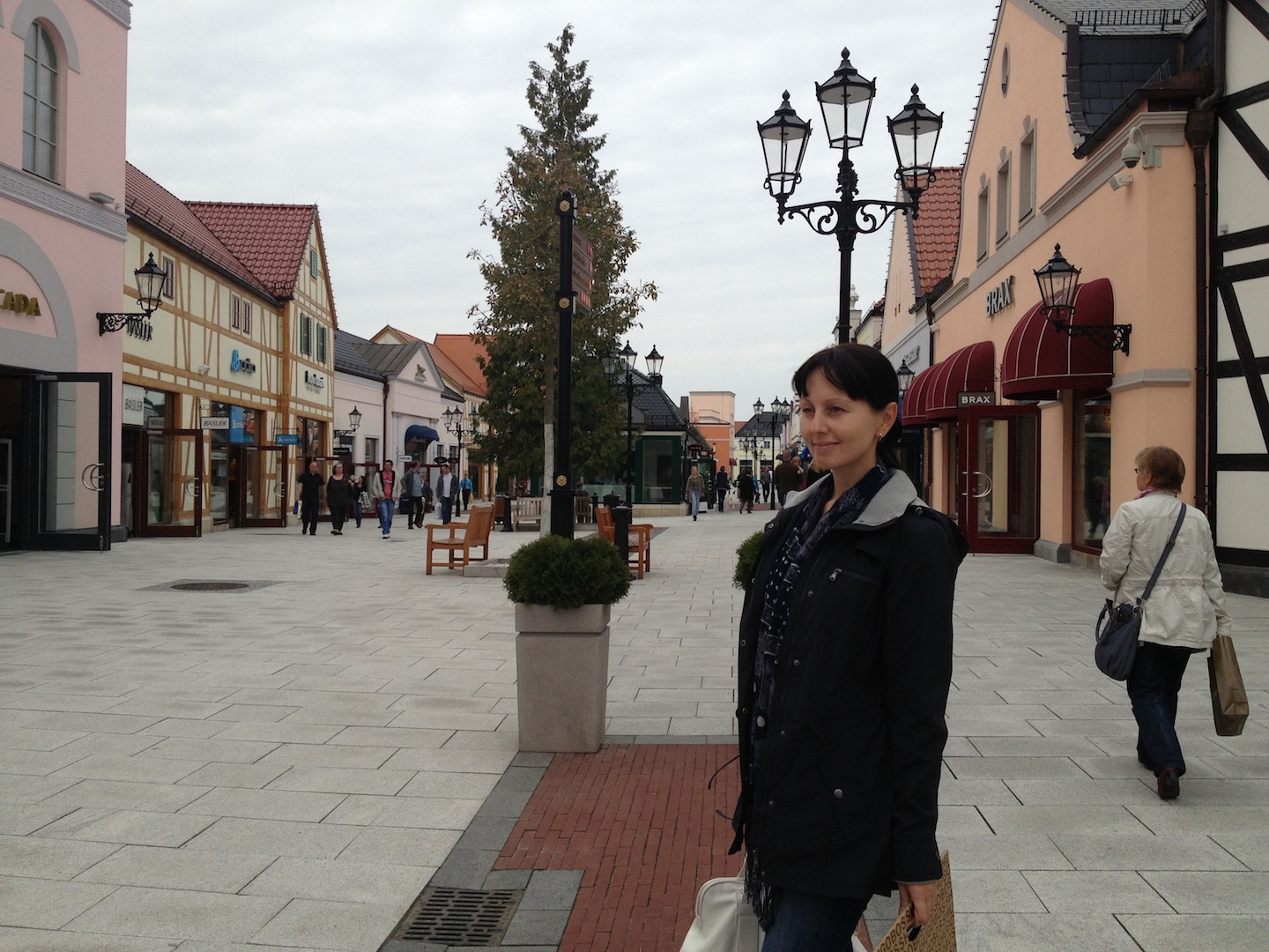 На шоппинг мы поехали в Designer Outlet в получасе езды от Берлина. Он оформлен в духе средневекового городка, где магазины располагаются в отдельных симпатичных домиках с башенками, вывесками на цепях под старину, а между домиками на улицах растут деревья, стоят лавочки и фонари.