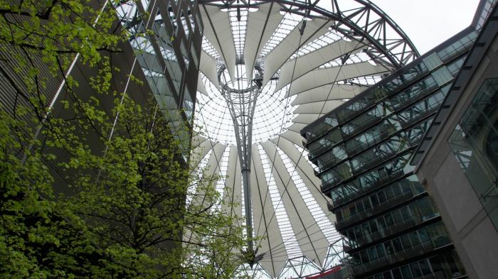 Ноги от ходьбы ныли уже ощутимо, поэтому, дойдя до стеклянного купола SONY-Center, мы первым делом устроились в кафе отдохнуть и поесть мороженого.