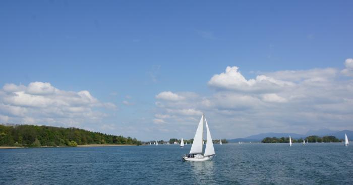 Вот так, любуясь открывающимися видами, мы и доехали до городка Приен – ам – Кимзее. Парковку выбрали в двух шагах от билетных касс на кораблики, купили билеты и поплыли на остров Херренинзель, где расположен еще один из замков легендарного Людвига II, последнего короля Баварии.