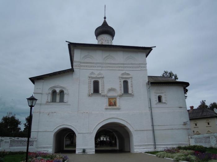 Перед выездом из Вологды заехали снова в Спасо-Прилуцкий монастырь, история его началась ещё в 14 веке. Постройки сохранились 16-19 веков. Монастырь в настоящее время — мужской, действующий. На фото — святые врата с надвратной Вознесенской церковью конца 16 века.