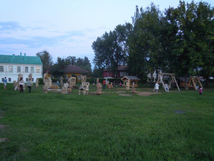 Вот такая детская площадка в Суздале — не пластиковые горочки и качели, а рубленные из дерева.