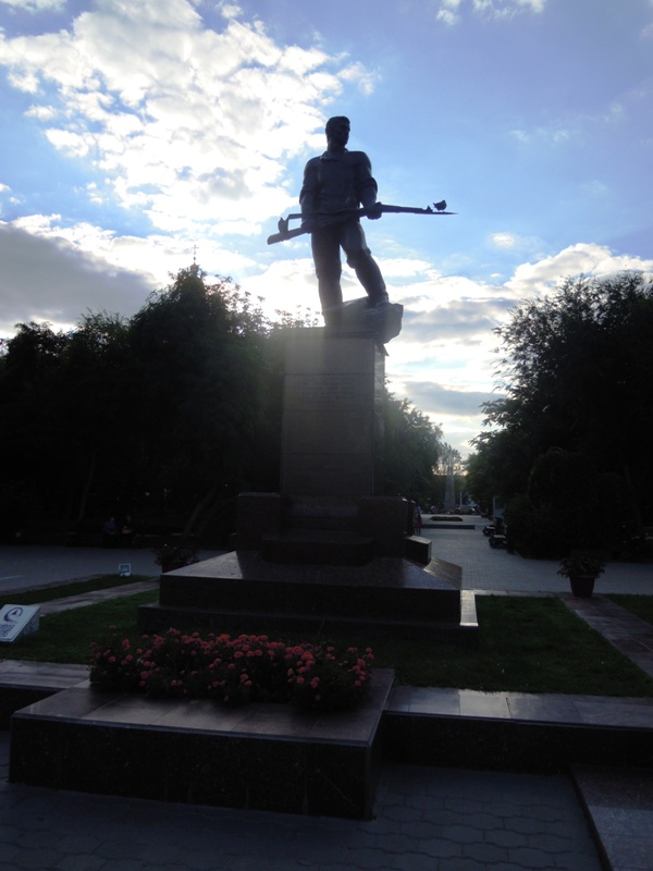 Этот казак стоит напротив музея боевой славы.