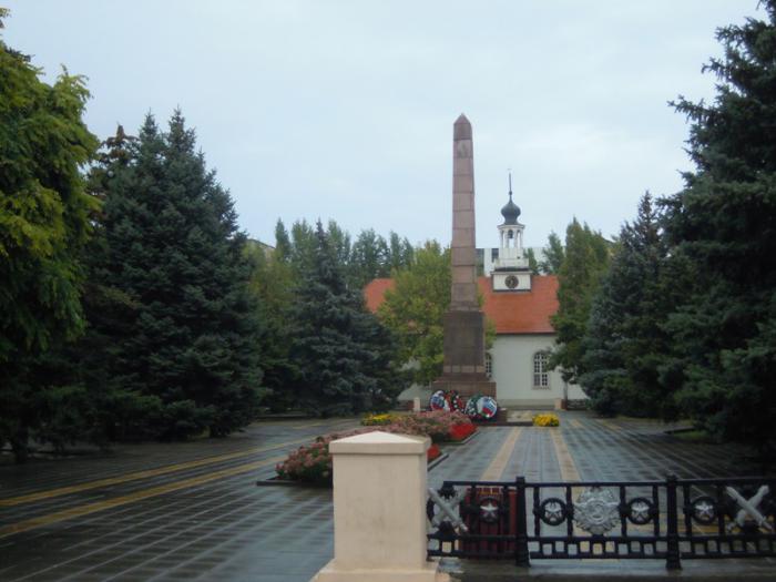 Небольшой парк с военным обелиском.