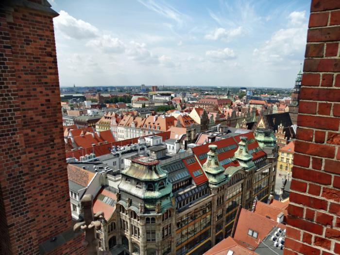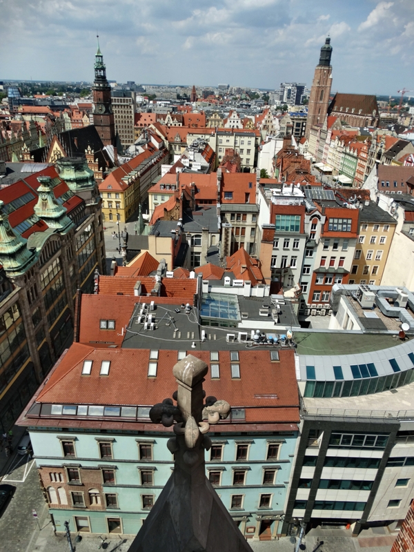 Он соединяет на большой высоте две башни храма, и с ним связана любопытная легенда: считается, что на мосту иногда можно заметить призраков. Эти привидения принадлежат душам девушек, которые заводили знакомства с неженатыми мужчинами, не желая при этом вступать в брак, чтобы не заниматься бытом и домашним хозяйством. В наказание за такую ленивую расчётливость они обречены до скончания веков скитаться по узкому мостику со швабрами в руках, а также называться ведьмами. Приведений мы не увидели, зато насладились прекрасными видами Вроцлава с высоты птичьего полета.