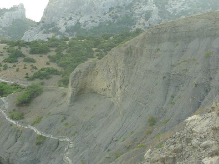 По этой туристической тропе я отправилась прогуляться, мои спутники потеряли бдительность и отправились за мной, о чём после, наверное, пожалели: мы с Мариной в платьях, я — на каблуках, она — в сланцах. Я-то как раз цеплялась каблуками, у Марины ноги скользили. В результате, Паша упал, Марина съехала на «пятой точке». Я шла впереди, тихонько посмеивалась, «всё — на пользу». (По приезду домой, Марина похудела на 2 кг).