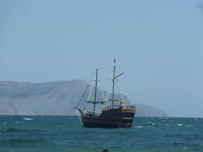 Вот такой красивый фрегат стоял на море.