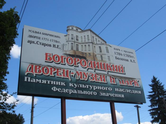 Дворец, был построен в 1773 — 1783 годах. В этом доме жил декабрист Василий Алексеевич Бобринский (1804-1874), внук Екатерины II, в самом восстании он не участвовал. И в этом же доме родилась Софья Алексеевна Бобринская (1866-1927), потомок графа Алексея Бобринского, основательница Богородицкой общины сестер милосердия, участница Русско-японской и Первой мировой войн.