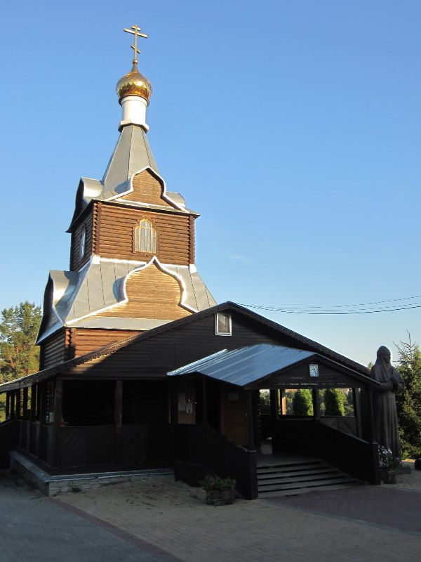 Церковь Николая Чудотворца в монастыре, постройка 2000-х годов, рядом — скульптура местночтимой блаженной затворницы Мелании.