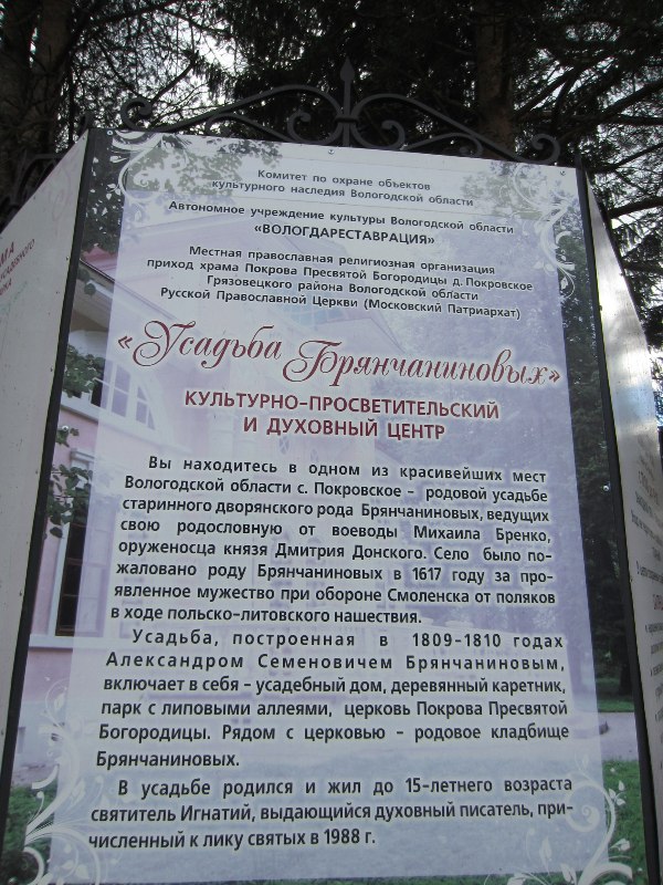 После прогулки по Вологде мы отправились в сторону Москвы, но решили заехать еще в село Покровское, это в 28 км от Вологды, в этом селе находится усадьба Брянчаниновых.