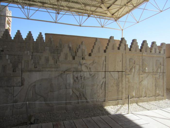 Барельеф «Лев (»лето") убивает быка («зиму»)" на южной части восточной лестницы в «Ападану» — «Дворец приемов царя Дария».
