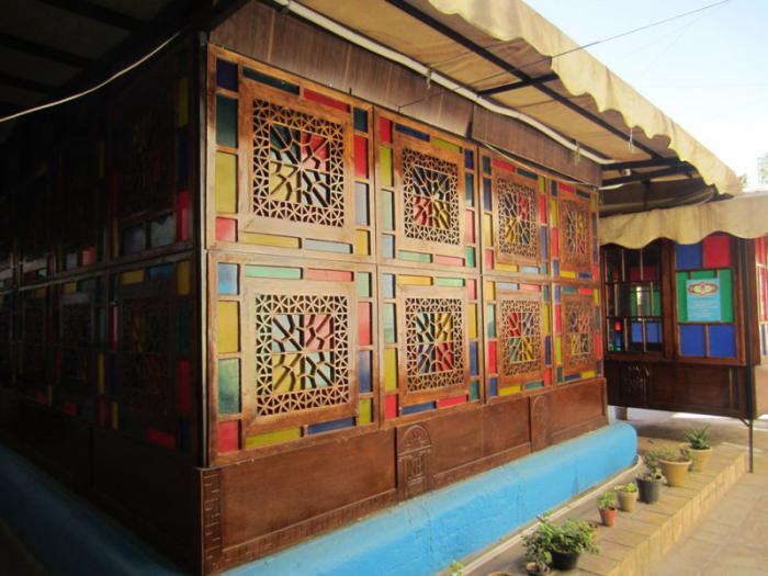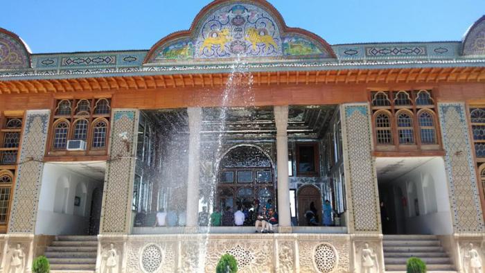 Вид на бируни «Дома Кавамов». «Бируни» — помещение для организации вечеринок, торжественных приемов гостей. В прежние времена и сад, и его здания, были лишь частью большого жилого комплекса семьи Кавам. По центру бируни расположен talar — «талар» — традиционная терраса перед «тронным залом» — залом официальных приемов, по сути — зал ожидания, приемная.