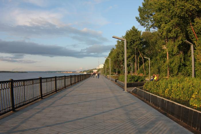 Далее пошли на набережную. Дорога туда оказалась перекрыта, велись строительные работы. Но проследив за местными жителями мы нашли обходной мимо заборов. Отремонтированная набережная выглядит симпатично, удобные скамейки с высокими спинками, везде клумбы с цветами, гуляет много молодежи и много парочек. Вид на Каму потрясающий, через реку видны 2 моста, ширина реки огромная, Нева в сравнении просто речушка.