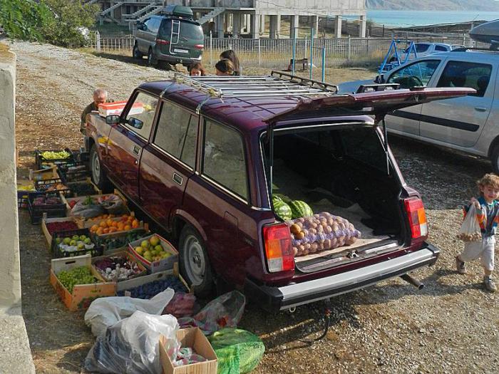 Складывается ощущение, что в Коктебеле, как и в самом Крыму в это время года приезжих больше, чем коренных жителей. Тем не менее они довольно доброжелательно к нам относились. Проехав этот город насквозь мы вновь стали подниматься в горы. Вокруг плантации винограда. Это мне очень напомнило Среднеазиатское предгорье. И когда на одном из заездов на виноградные плантации продавали виноград, проехать мимо я не смог. Мы остановились и накупили несколько сортов винограда на 450 руб., обеспечив себя им до конца нашего пребывания в Крыму. Как выяснилось позже, мы эту покупку совершали у подножья скалы Иклма-Кая высотой 433м над уровнем моря.