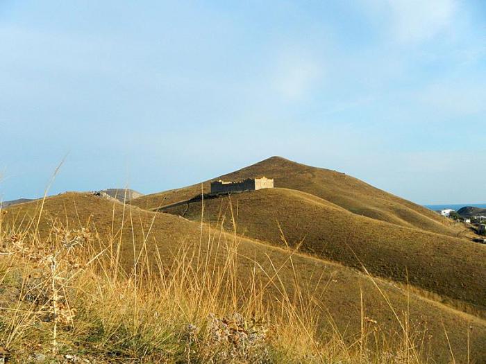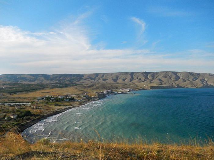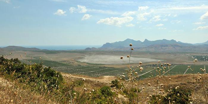 Вид с горы открывается завораживающий. Перепад высот почти 100м. Внизу растут виноградники, чуть дальше пересыхающее в летнее время озеро Барак-Куль. С правой стороны возвышаются зубцы горного массива Кара-Даг и самый острый его зуб — Иклма-Кая. Слева в голубой дымке виднеется Коктебель, а дальше за горизонт разливается море, голубое, небесного цвета море. Странно и почему его назвали Черным?