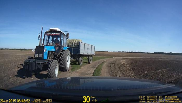 На грунтовой дороге нам встречается колесный трактор с прицепом. Чтобы разъехаться тракторист нас подождал на развилке. Я поздоровался с ним, кивнув ему головой. Он ответил тем же, как будто мы знакомы с ним 100 лет.