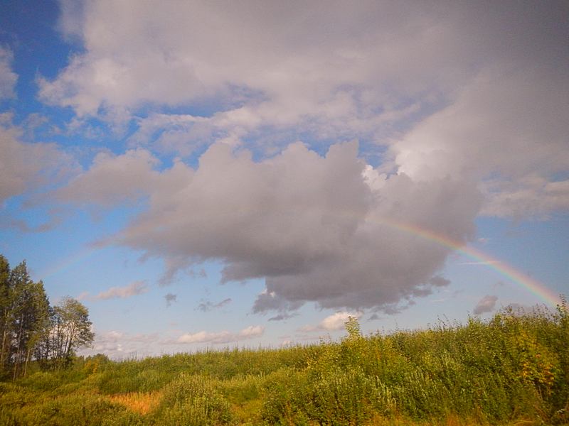 После выезда из Твери погода подарила нам красивейшую радугу от горизонта до горизонта. Но пока мы доставали камеру за окном появились лесная гряда и пригорок, да и сама радуга успела потускнеть. Наяву за минуту до съемки она выглядела потрясающе!