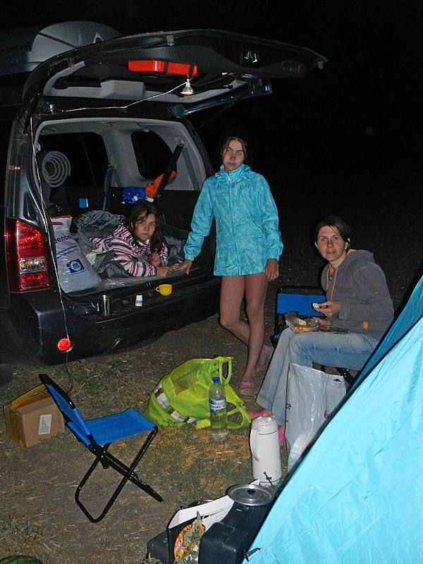 Пробки закончились, но и день тоже заканчивался, а нам по показаниям навигатор нужно было проехать еще 190 км. Не много, но тогда, когда солнце не слепит глаза, когда в запасе много времени и когда не хочется спать. Но мы настойчива едем вперед. Другого варианта у нас просто нет. Проехали 20 км, потом еще. Совсем стемнело и мы остановились на импровизированный ужин. Едим, отдыхаем. Потом снова в путь. Моя семья мне помогает, информируя о приближении тому или иному знаку. При подъезде к белым табличкам с названиями населенных пунктов дочка кричит: «Папа, снижай скорость, город!»
