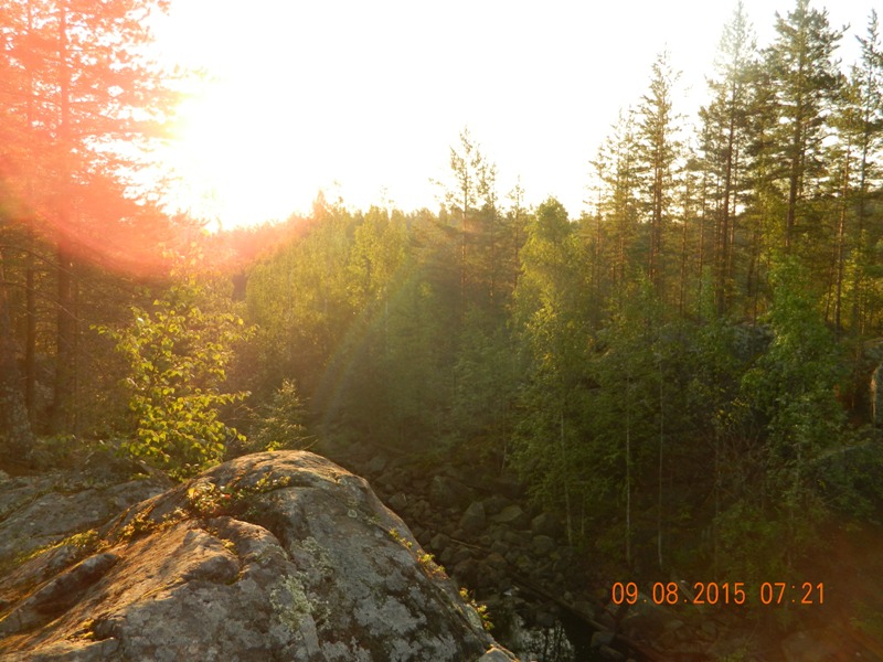 Вулкан Гирвас располагается недалеко от одноименного поселка на реке Суна. К поселку ведет дорога, которая асфальтировалась очень давно. Места там очень глухие, а к тому же вдалеке гремела гроза, было принято решение свернуть к реке. Посмотрев по навигатору первый отворот, ведущий к реке, мы на него свернули. Проехав несколько сот метров, мы почувствовали, что заезжаем в чащу леса. Было очень жутко. Выехав опять на дорогу и проехав дальше, мы опять свернули в лес и наконец-то выехали к реке. Быстренько развернув тенд, мы разожгли костер, чтобы приготовить ужин. Стемнело очень быстро, т.к. все небо заволокло тучами, сверкала молния. Ощущения были не из приятных. Внизу шумит река, с неба льется дождь и сверкает молния, а в перерывах из чащи леса слышались какие-то звуки. Наскоро поужинав, мы с дочкой забрались в машину спать, а муж остался снаружи «наслаждаться грозой». Встав наутро как обычно рано, я первым делом, пошла осматривать окрестности. Вышло солнце, на деревьях и траве сверкали капли дождя, весело шумела речка и пели птицы. Схватив фотоаппарат, я побежала фотографировать природу.