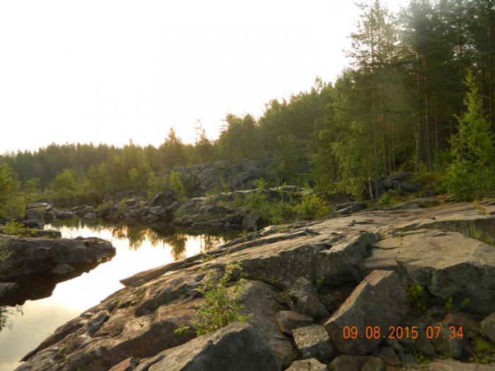 Очень добродушный и упитанный пес, наверное он пришел из ближайшей деревни. Накормив его сахаром и кашей, мы стали собираться. Природа в Карелии потрясающая: скалы, камни, лес, ягель, на котором можно лежать. Нам очень не хотелось уезжать из этого места, но надо было продолжать свое путешествие.