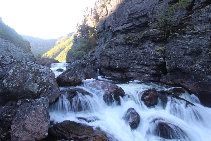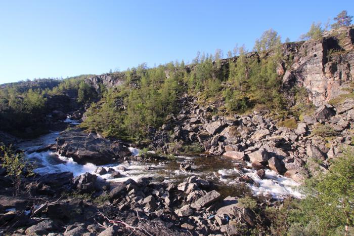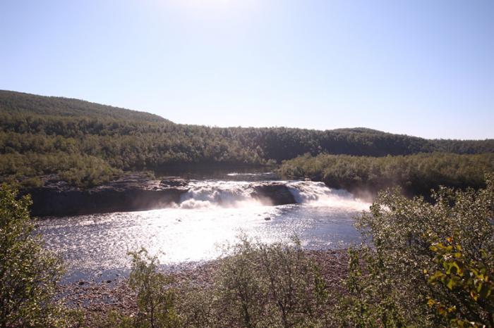 Совершенно неожиданно дорога, по которой мы поехали, оказалась очень красивой и живописной, она проходит по ущелью вдоль бурной реки, останавливались несколько раз, никак не могли налюбоваться. Вскоре бурный поток превратился в широкую и спокойную реку. По пути мы остановились около водопада Pikefossen (84 км от Alta), правда любоваться этим водопадом лучше ближе к вечеру, в первой половине дня солнце стоит над водопадом и фотографии не такие удачные получаются.