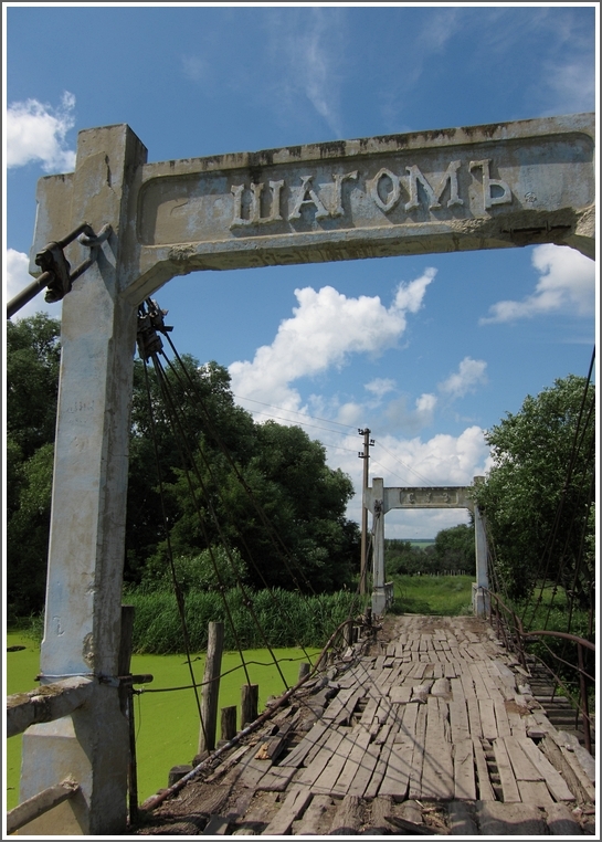 Прекрасный образчик технического совершенства и архитектурной наполненности стоит на реке Сокурке. И держится только по причине, «на совесть» сделанной, работы наших предков. Современники не приложили ни каких усилий, чтобы сохранить этот красивый и редкий для наших мест вантовый мост. Так, что спешите! И своими ладонями прикоснитесь к началу прошлого века. Переместитесь в то время. Пройдите своими ногами с одного берега на другой «шагомъ». Именно таким образом предлагается переходить мост. О чем гласят надписи в верхней части пилонов.