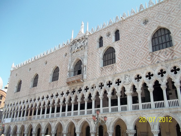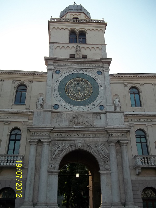 , известный своим удобным расположением: близостью к центру Падуи (15 минут пешком) и железнодорожной станции (5 минут пешком), откуда можно отправиться в Венецию. Изначально целью визита в Италию у нас значилась, естественно, Венеция. Но, когда я столкнулась с проблемой найти там отель с парковкой (очень дорого), изучила вопрос, поняла, что многие поступают так: бронируют и проживают в ближайших окрестностях Венеции, а до города добираются электричкой или автобусом, чтобы спокойно без нервов погулять по этому великолепному городу. Однако планируя маршрут, я убедилась, что и Падуя без сомнения достойна того, чтобы посвятить ей отдельное время. Поэтому по приезду в город, быстренько приняв душ и переодевшись (а следует заметить, что в июле в Европе действительно градусов 35), мы отправились на знакомство с Падуей. Ориентируясь по карте, любезно предоставленной нам в отеле, мы двинулись в центр города. Так мы оказались на площади Синьории, где находится Адмиралтейство, центральную часть которого украшает Часовая башня с часами XV века. Кроме времени они показывают день недели, месяц, фазу Луны и знак Зодиака.