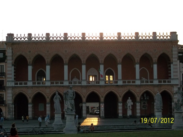 Дальше мы двинулись к самой большой площади-парку Падуи, которая находится к югу от исторического центра – Прато-делла-Валле. Ее название переводится как «луг в долине», а площадь составляет около 90000 кв.м Муж не поверил, но так говорит викепидия. Прато-делла-Валле имеет форму эллипса, окруженна каналом и двойным рядом статуй выдающихся падуанцев. На самой площади расположено большое количество старинных особняков и дворцов. Особенно красив — Лоджия Амулеа.